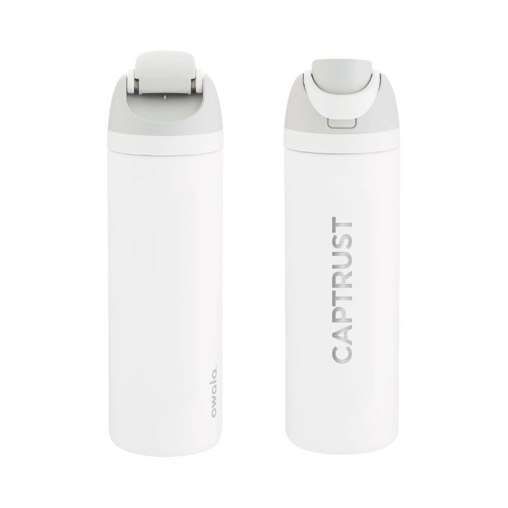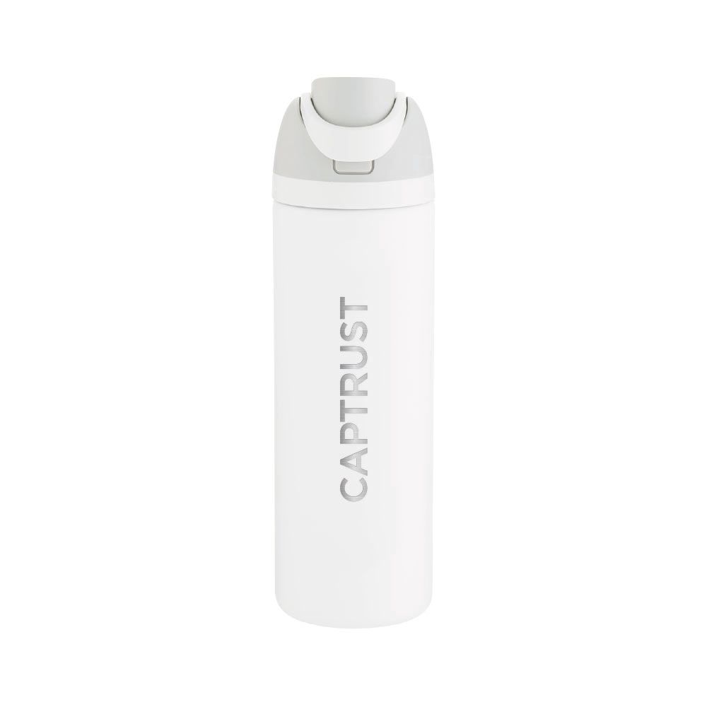 24 oz double wall 18/8 stainless steel thermal bottle with copper vacuum insulation, dual-purpose threaded lid, push-button locking mechanism, sip opening, built-in straw, and powder coated finish.